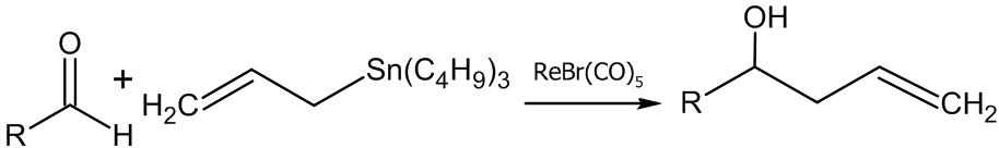 - Реакция аллилтрибутилстанната с альдегидами в присутствии рениевого комплекса (Yutaka Nishiyama, Fujio Kakushoua, Noboru Sonoda, 2004 год)[48]:
