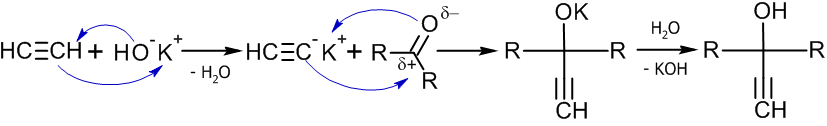 Механизм данной реакции связан с нуклеофильным присоединеним этинильного карбаниона к карбонильной группе[32]: