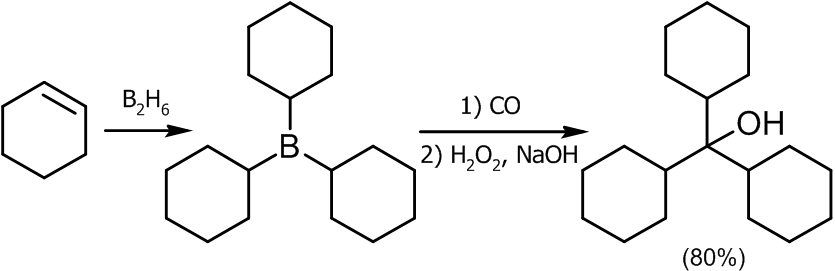 Одним из лучших способов получения третичных спиртов является присоединение к окиси углерода к алкилборанам. Реакция легко протекает при обычном давлении и температуре около 125 °C, в качестве растворителя используется диглим[7]: