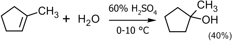 В лабораторной практике метод кислотной гидратации применим весьма ограниченно как из-за перспективы получения смеси продуктов, так и низких выходов. Чаще его используют для получения третичных спиртов, но и в этом случае выход, обычно, не превышает 40-45 %[8]: