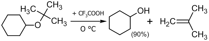 Для расщепления эфиров могут использоваться также кислоты Льюиса: BF3, BCl3, AlCl3 и др[25], а также сильные органические кислоты. Например, расщепление трет-бутилциклогексилового эфира трифторуксуной кислотой происходит по механизму SN1 с образованием циклогексанола и 2-метилпропена[26]: