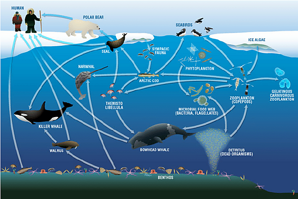 - Вертикальный транспорт углерода (в виде морского снега) с поверхности на морское дно, связанный с цветением в полынье, обеспечивает питательные вещества, необходимые для поддержания богатства бентосных сообществ[15].