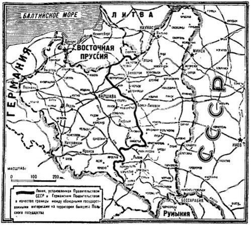 Территории к востоку от рек Западный Буг и Сан были присоединены к Украинской ССР и Белорусской ССР. Это увеличило территорию СССР на 196 тысяч км², а население — на 13 млн человек. Новая граница в основном совпадала с «линией Керзона», рекомендованной в 1919 году Парижской мирной конференцией в качестве восточной границы Польши, так как она разграничивала области компактного проживания поляков, с одной стороны, украинцев и белорусов, с другой. Англия поддержала Советский Союз в присоединении территорий Западной Украины и Западной Белоруссии, занятых Польшей в ходе Советско-польской войны в 1921 году[81].