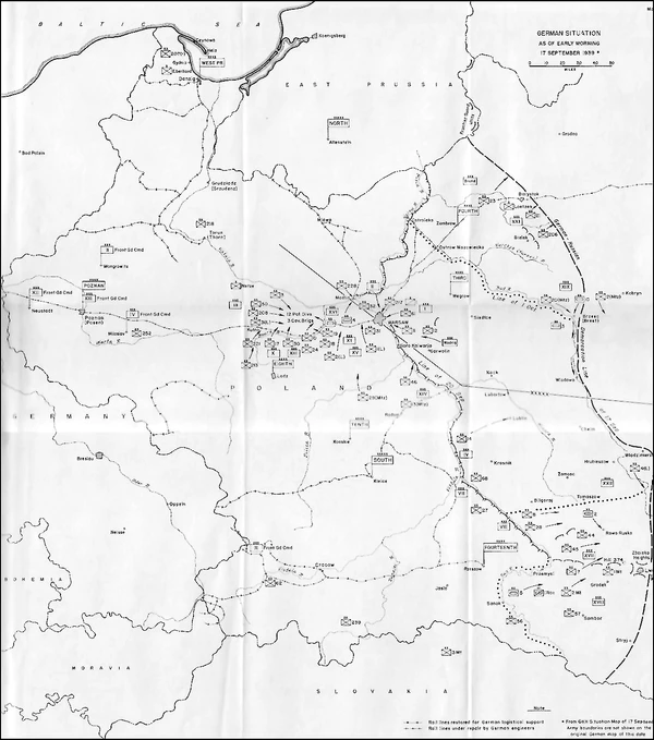 К 16 сентября наступавшие с севера и юга войска немецких армий вышли на линию Осовец — Белосток — Бельск — Каменец-Литовск — Брест-Литовск — Влодава — Владимир-Волынский — Замосць — Львов — Самбор, а войска 10-й армии, форсировав Вислу, подходили с юго-запада к Люблину. В планах германского командования не предполагалась остановка продвижения войск. При темпе продвижения немецких механизированных войск в то время 25—30 км в сутки, занять всю Восточную Польшу (Западную Украину и Западную Белоруссию) они могли в течение 4—8 суток, то есть к 21—25 сентября при том, что единого польского фронта перед ними уже не было, как не было и достаточных резервов и времени у польского командования для его формирования[6].