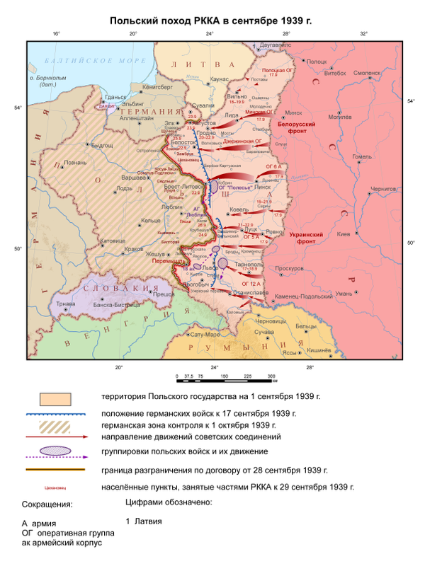 14 сентября Военным советам БОВО (командарм 2-го ранга М. П. Ковалёв, дивизионный комиссар П. Е. Смокачёв и начштаба комкор М. А. Пуркаев) и КОВО (командующий войсками округа С. К. Тимошенко, члены ВС В. Н. Борисов, Н. С. Хрущёв, начальник штаба комкор Н. Ф. Ватутин) направляются директивы Народного комиссара обороны СССР Маршала Советского Союза К. Ворошилова и Начальника Генерального штаба РККА — командарма I ранга Б. Шапошникова за № 16633 и 16634 соответственно «О начале наступления против Польши»[26].