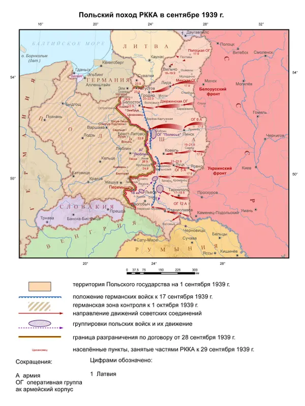 1. К исходу 16 сентября 1939 г. скрытно сосредоточить и быть готовым к решительному наступлению с целью молниеносным ударом разгромить противостоящие войска противника: