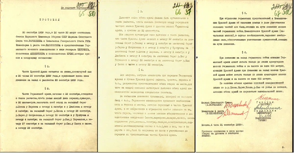 2 октября 1939 года в 15 часов 50 минут состоялась беседа Народного Комиссара Обороны СССР Маршала Советского Союза Ворошилова и Начальника Генерального штаба РККА Командарма 1 ранга Шапошникова с представителями Германского военного командования в лице генерала Кестринга, полковника Ашенбреннера и подполковника Кребса, которые пришли к следующему соглашению.