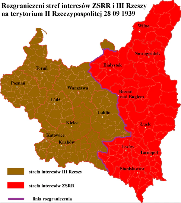 Формальное основание ввода советских войск в Польшу было изложено в ноте, зачитанной польскому послу в Москве В. Гржибовскому. Фактически СССР выступал в рамках секретной договорённости с Германией о границах сфер взаимных интересов[2].