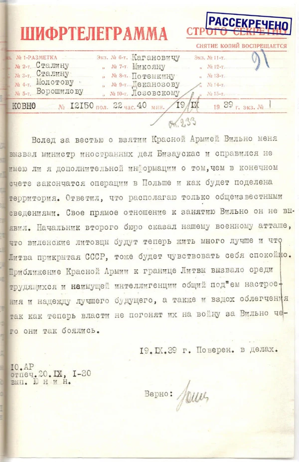 В завершении Молотов затребовал немедленно прояснить ситуацию с Вильно, поскольку СССР не желает конфликта с Литвой, и имеется ли уже договорённость немецкой стороны с Литвой в отношении Виленской области и того, кто будет оккупировать сам город.