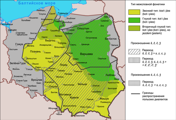 - Малопольский диалект, занимающий территорию Малопольского, Подкарпатского, Свентокшиского, Лодзинского и Люблинского воеводств. Его основа — диалект вислян. Отличается от других диалектов сочетанием в его фонетической системе мазурения и звонкого типа сандхи.