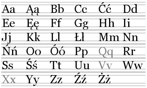В основе польского алфавита (alfabet polski) лежит латиница. В состав алфавита включены следующие буквы[40]: