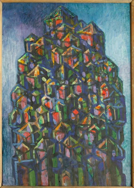 На светло-сером фоне представлена башнеобразная конструкция, выполненная в коричневых тонах. Составляющие её вертикальные объёмы различаются по величине и завершаются треугольными формами. Каждый элемент выделен чёрной контурной линией, подчёркивающей геометрию композиции. Работа относится к направлению абстракционизм, а использование чётких форм и объёмов сближает её с геометрическим абстракционизмом.
