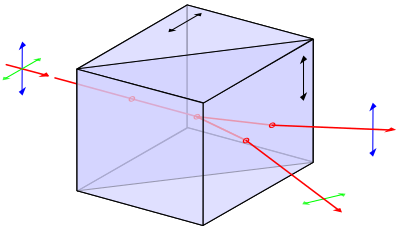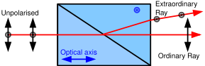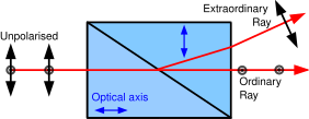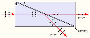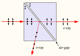 Призма Волластона и ход лучей в ней показаны на рисунке 7. Как и в вышеописанных призмах, она состоит из двух склеенных длинными гранями прямоугольных призм, часто образуя куб. Материалы склеенных призм имеют взаимно перпендикулярные оптические оси, в результате из призмы Волластона выходят два луча с взаимно ортогональными плоскостями поляризации, один из которых — обыкновенный луч (с s-поляризацией), а второй необыкновенный ((с p-поляризацией). Как правило, угол расхождения обыкновенного и необыкновенного лучей на выходе составляет величину от 1 до 45°.