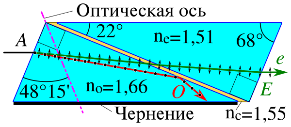Призма Николя представляет собой линейный поляризатор, ход лучей в котором представлен на рисунке 1. Принцип действия призмы Николя основан на эффектах двойного лучепреломления и полного внутреннего отражения. Геометрические параметры призмы Николя указаны на рисунке 1 в случае исландского шпата. Для призмы из этого материла угловая апертура полной поляризации составляет 29°.