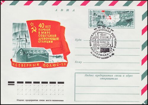 Конверт с оригинальной маркой «40-летие первой советской дрейфующей станции „Северный полюс-1“», СССР, 1977 (СК #41). Художник Ю. Косоруков. Спецгашение: «Филателистическая выставка „Полярфила-77“. 40 лет станции „Северный полюс-1“», Москва, почтовое отделение К-45, 14—22.05.1977