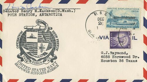Пример полярного конверта США: антарктический конверт, подписанный сенатором Г. М. Джексоном и отправленный 26 декабря 1959 года с ледокола USS Glacier (AGB-4) во время Операции Deep Freeze