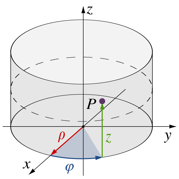 Цилиндрическая система координат, грубо говоря, расширяет плоскую полярную систему добавлением третьей линейной координаты, называемой «высотой» и равной высоте точки над нулевой плоскостью подобно тому, как декартова система расширяется на случай трёх измерений. Третья координата обычно обозначается как , образуя тройку координат .