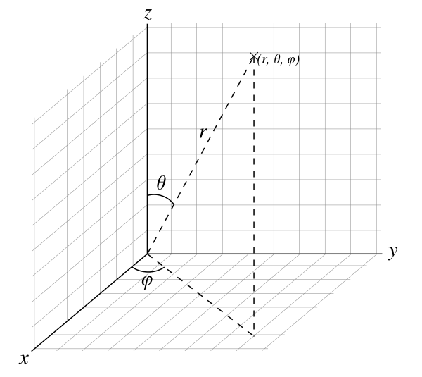 Также полярные координаты можно расширить на случай трёх измерений путём добавления угловой координаты , равным углу поворота от вертикальной оси (называется зенитом или широтой, значения находятся в интервале от 0 до 180°). То есть, сферические координаты, это тройка , где — расстояние от центра координат, — угол от оси (как и в плоских полярных координатах), — широта. Сферическая система координат подобна географической системе координат для определения места на поверхности Земли, где начало координат совпадает с центром Земли, широта является дополнением и равна , а долгота вычисляется по формуле [17].