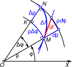 - Элемент длины в полярных координатах на плоскости определяется следующей формулой[14]: