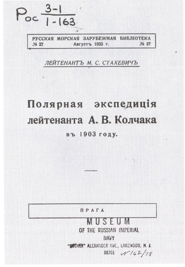 Стахевич, М. С. Полярная экспедиция лейтенанта А. В. Колчака в 1903 году: (Доклад, прочитанный 8 февраля 1933 года в «Кружке по научению Мировой войны» при Пражском народном университете) / Лейтенант М. С. Стахевич. — Прага: Изд. Кают-компании в Праге, 1933.- Толль Э. В. Плавание на яхте «Заря» / Пер. с нем. — М.: Географгиз, 1959. — 340 с.