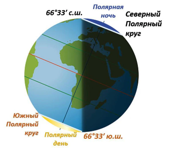 Полярные круги — это условные линии на поверхности Земли, географические параллели, отстоящие от экватора на 66°34′. Северный полярный круг расположен в Северном полушарии, Южный — в Южном. Оба полярных круга являются границами зон полярных дней и полярных ночей. Из-за неравномерности движения Земли в космическом пространстве наблюдается медленное уменьшение наклона земной оси, и полярные круги постепенно смещаются к полюсу, всё больше удаляясь от экватора. Их географическое положение нестабильно: фактически они сдвигаются примерно на 4 сантиметра в течение суток и почти на 14,4 метра в течение года[6].