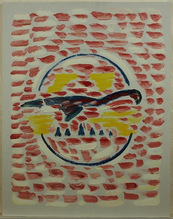 На картине на белом фоне размещены красные горизонтальные мазки, формирующие основу композиции. В центральной части изображён незамкнутый овал синего цвета, внутри которого по горизонтали летит глухарь синего цвета с красными включениями, направленный вправо. Над и под птицей расположены четыре жёлтых пятна, а в нижней части овала — шесть синих треугольников. Работа выполнена в жанре анималистики с использованием выразительной цветовой гаммы.