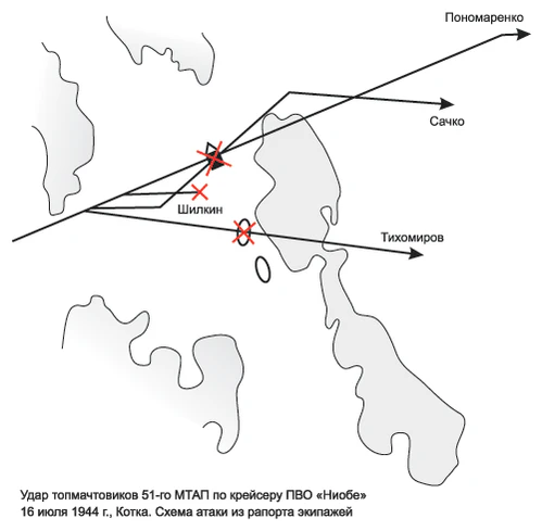 Активизация действий советской морской авиации и военно-морского флота на Балтике существенно повысили значимость военно-морской базы Котка как ремонтной базы Кригсмарине и финских ВМС. Однако рейд порта требовал серьёзного усиления противовоздушной обороны. С этой целью немецкое командование направило в Котку плавучую зенитную батарею «Ниобе». Советские самолёты-разведчики обнаружили корабль ещё 8 июля 1944 года в Хельсинки, но вследствие плохих погодных условий и удачной маскировки крейсер ПВО был ошибочно идентифицирован как финский броненосец береговой охраны «Вяйнямёйнен». Первая попытка его уничтожения была предпринята 12 июля 1944 года. 30 бомбардировщиков Пе-2 атаковали «Ниобе» на рейде Котки, однако из-за плотного зенитного огня ни одна бомба не попала в цель. Это заставило командование ВВС Балтийского флота разработать специальную операцию по уничтожению корабля, в которой приняло участие 132 самолёта. Ударную группу составляли 4 лучших экипажа топ-мачтовых бомбардировщиков «Бостон», ведомые майором И. Н. Пономаренко. 16 июля 1944 года первыми Котки достигли истребители 4-го гвардейского истребительного полка, которые заблокировали финский аэродром. Затем по крейсеру нанесли удар две группы пикирующих бомбардировщиков подполковника В. И. Ракова. Две авиабомбы ФАБ-250 попали точно в корабль, ещё 12 разорвались в зоне поражения цели. В результате «Ниобе» начал крениться на правый борт и практически перестал вести огонь. Третья группа Пе-2 без бомбовой нагрузки имитировала пикирование, отвлекая огонь береговых зенитных батарей на себя. Под их прикрытием группа Пономаренко, маневрируя между островами и портовыми сооружениями на бреющем полёте, вышла точно на цель и сбросила четыре ФАБ-1000, две из которых попали в корабль. После сильного взрыва «Ниобе» затонул. Потери экипажа плавучей батареи составили 63 человека убитыми и пропавшими без вести. Ещё 83 моряка получили ранения.