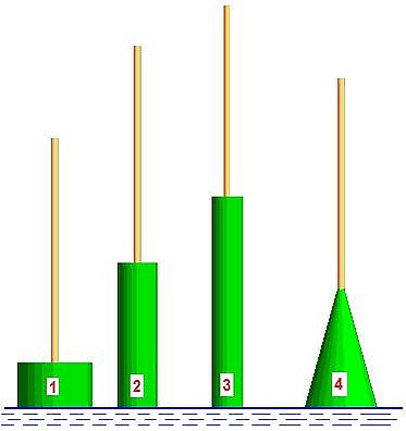 Плавающий поплавок подчиняется закону Архимеда. Закон Архимеда оперирует только с объёмом, погружённым в воду, и весом вытесненной им воды. При поклёвке вертикально огруженный поплавок притапливается или всплывает, то есть изменяется его подводный (надводный) объём. Рыболов видит изменение объёма надводной части поплавка. Величина погружения (подъёма) зависит от формы поплавка около ватерлинии, чем тоньше эта часть поплавка, тем на большую величину переместится поплавок. На рис. представлены 4 поплавка с равными по объёму надводными частями тела. Для всех поплавков, представленных на рис., топящие силы, при которых их надводные части скроются под водой, равны, так как равны объёмы этих частей.