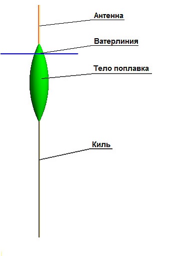 Поплавок — обычно тело вращения, насаженное на стержень. Рабочее положение поплавка — вертикальное, при котором над водой находится часть тела с выступающим стержнем. Нижний конец стержня — киль, верхний — антенна. Надводная часть служит для наблюдения за поплавком.