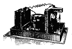 Теперь остаётся только демонстрировать прибор в связи с телеграфом. Вопрос состоит только в подборе элементов, вибратора, молоточка, сопротивления обмоток телеграфа и т. д. Все это надо подобрать. Всякая волна делает точку на телеграфной ленте, но одними точками действовать нельзя, надо, чтобы вибратор действовал периодически. 5, 10, 15 точек дадут черту, и сигнализация становится возможной.
