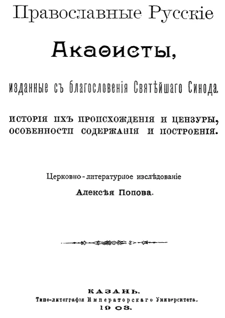 В 1903 году состоялась защита докторской диссертации Попова «Православные русские акафисты, изданные с благословения Святейшего Синода. История их происхождения и цензуры, особенности содержания и построения. Церковно-литературное исследование». Работа Попова — первый опыт описания истории всех акафистов, опубликованных к началу XX века. Новаторство этой работы заключалось в том, что Попов решил в научных целях воспользоваться особенностями синодальной бюрократии: утверждение (или неутверждение) богослужебного текста сопровождалось перепиской, благодаря которой историк может многое узнать: здесь может содержаться имя автора текста, имя архиерея, представившего этот текст Синоду, замечания рецензентов и ответы на них, имена цензоров и их реакцию на текст и т. д.[1]