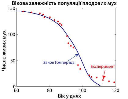 Одной из первых и наиболее распространённых сегодня математической моделью описания старения многоплодных организмов является так называемый закон смертности Гомпертца-Мейкхама[1][2] (или просто Гомпертца), согласно которому вероятность смерти экспоненциально возрастает с возрастом: , где x — возраст, а p — относительная вероятность смерти за определённый промежуток времени, a и b — коэффициенты. Таким образом, при отсутствии постоянного члена a, размер популяции снижается с возрастом по двойной экспоненте [3].