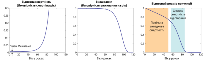 Примеры графического изображения смертности в зависимости от возраста для той же самой условной популяции людей, что следует закону Гомпертца-Мейкхама. горизонтальная ось — возраст в годах 1. Относительная смертность (вероятность смерти в год) 2. Выживание (вероятность выживания в год) 3. Относительный размер популяции (слева-медленная случайная смертность, справа-быстрая смертность от старения)