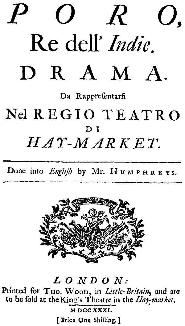 Поскольку Гендель в 1726 году уже сочинил Александра об Александре Македонском и его индийском походе, название новой оперы неизбежно пришлось изменить, и выбор пал на Poro, Re dell’Indie. В то же время в центр внимания была выдвинута фигура индийского царя Пора.