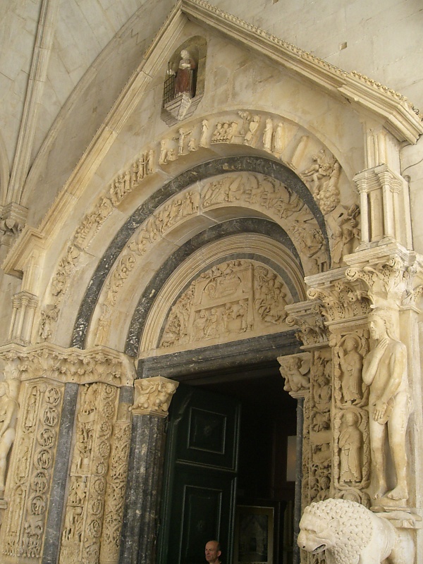 Во второй половине XIII века приступили к пристройке портала в стиле ранней готики. Над фигурами льва и львицы были установлены фигуры Адама и Евы, а на шести внешних пилястрах вместо того, чтобы продолжить работу мастера Радована, были вырезаны барельефы шести апостолов. Над люнетом добавлен еще один полукруглый ряд рельефов со сценами, изображающими жизнь и мучения Христа. Все эти сложения были сделаны последователями мастера Радована и своим качеством исполнения они отстают от первоначального замысла Радована.