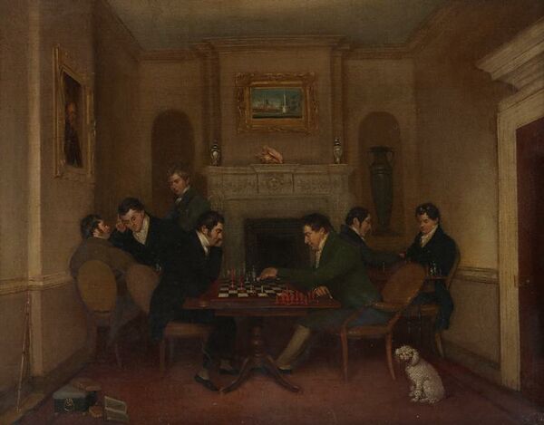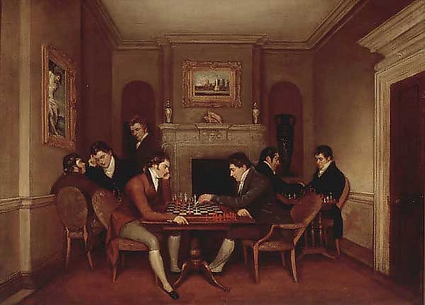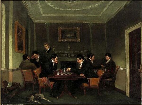 - «Партия в шахматы во дворце Фосс в Берлине» — заседание первого немецкого шахматного клуба Schadows Schachklub за коллективным анализом позиции на доске (1818, художник Иоганн Эрдман Хуммель).