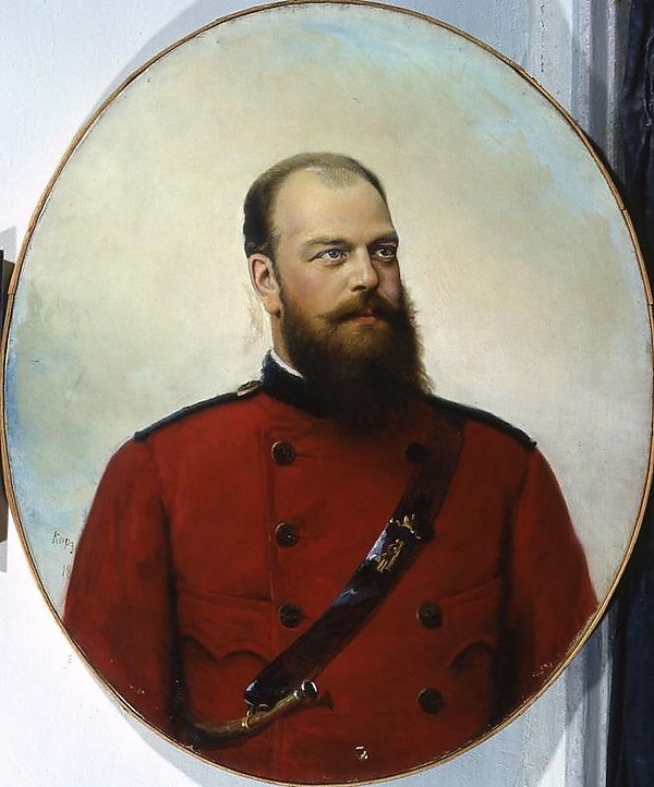 На светлом фоне в 3/4 поворота вправо изображён молодой мужчина. Его внешность отличается короткой стрижкой с залысинами, рыжеватыми бородой и усами. Он одет в красный охотничий костюм с чёрным меховым воротником-стойкой, погонами, клапанами на груди и двумя рядами пуговиц. Через левое плечо проходит лента с императорским вензелем, включающим изображение короны и инициалов, что подчёркивает принадлежность к награждённым или приближённым к императорской власти. В нижней части композиции изображён охотничий рожок.