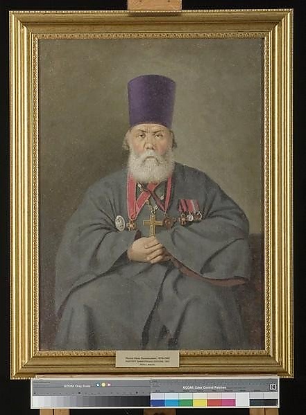 На картине поколенно изображён Священнослужитель, представленный крупным планом во фронтальной композиции. Кисти рук сложены перед грудью, что подчёркивает сосредоточенность и внутреннюю собранность портретируемого.