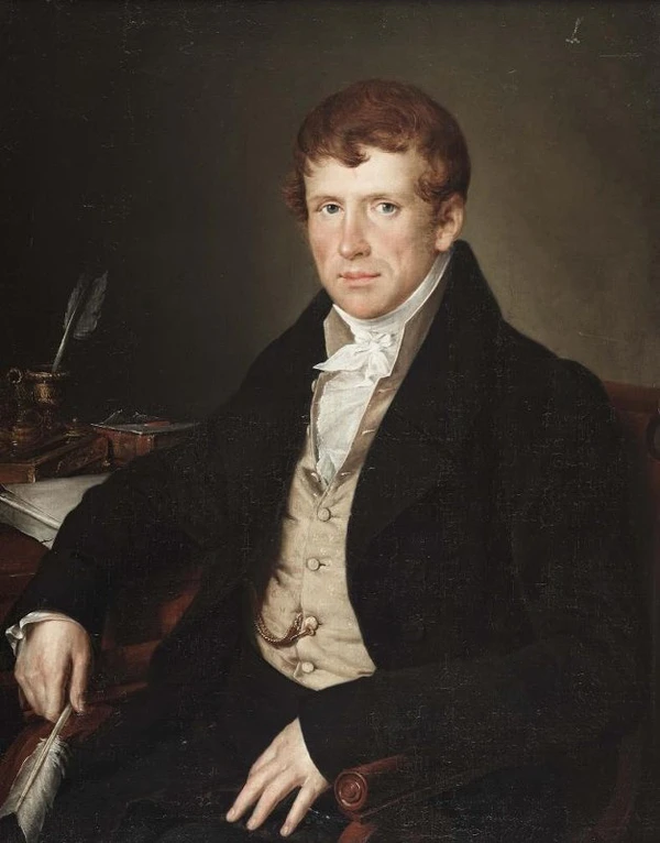 На полотне представлен поколенный портрет мужчины средних лет с короткими каштановыми волосами, сидящего в кресле в положении три четверти влево. Левая рука мужчины покоится на колене, правой он облокачивается о стол и держит гусиное перо. Одет в чёрный сюртук, светлый жилет и белую рубашку с жабо. Слева от фигуры изображён стол, на котором располагаются чернильница, бумага и книга в кожаном переплёте.