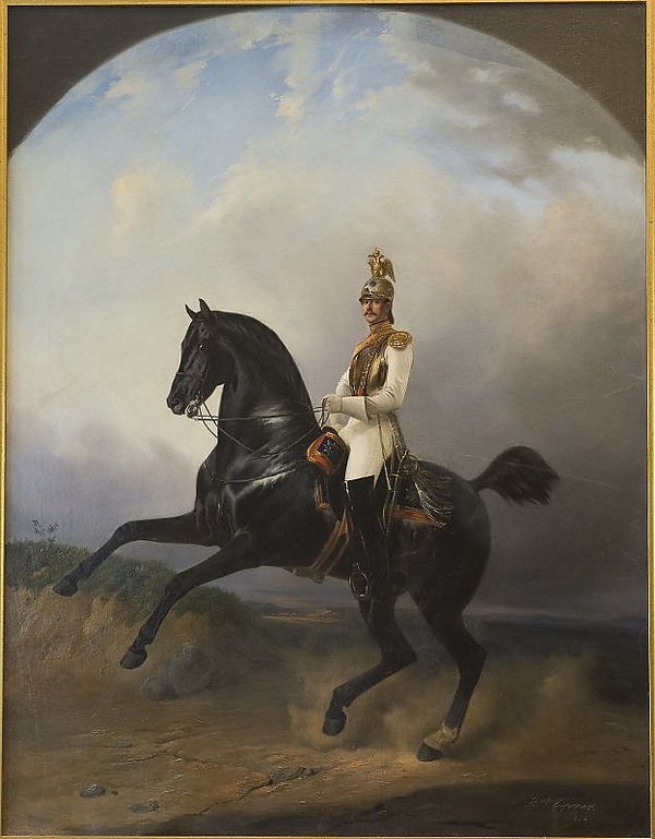 Седло украшено красным вальтрапом с монограммой Екатерины II под короной, обшитым красно-белым лампасом. На втором плане справа видна шеренга всадников в аналогичной форме, слева — офицер лейб-гусарского эскадрона; все лошади гнедой масти, с красными вальтрапами. Фон составляет пологий пейзаж с зелёной травой и несколькими деревьями слева, а треть композиции занимает голубое облачное небо. Цветовая гамма построена на сочетаниях коричневых, зелёных, красных, синих, чёрного и белого тонов; живопись преимущественно гладкая, местами использована пастозная техника.
