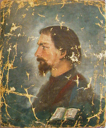 На полотне представлен погрудный профильный портрет мужчины на условном голубовато-сером фоне. Удлинённое лицо с тонкими чертами, тёмно-русые волосы, подстриженные «в скобку», рыжеватые усы и борода клинышком подчёркивают индивидуальность модели. Взгляд светло-серых глаз устремлён вдаль. Одежда напоминает чёрный подрясник, что придаёт образу строгость и сдержанность. В правом нижнем углу изображена раскрытая книга на церковнославянском языке.