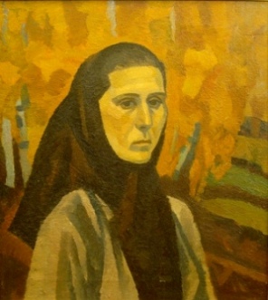 На переднем плане картины представлено погрудное изображение молодой женщины в трёхчетвертном повороте вправо. Её голова покрыта тёмно-коричневым платком, завязанным под подбородком, а на ней светло-серое платье. На заднем плане изображён осенний пейзаж с берёзами, покрытыми жёлто-оранжевой листвой. В композиции картины сочетаются сдержанные оттенки одежды и насыщенные цвета фона.