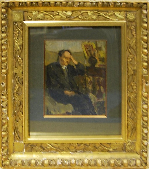 На этюде представлен М. Сарьян, сидящий в кресле в своей мастерской. Художник изображён в чёрном костюме, с левой рукой, подпирающей голову. Работа выполнена в жанре портрета.