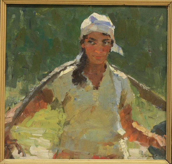 На тёмно-зелёном фоне представлен поясной портрет молодой девушки с коромыслом на плечах. Голова девушки слегка опущена, взгляд направлен влево. Она повязана белым платком, из-под которого выбиваются тёмные волосы; длинная прядь лежит на правом плече. Ворот кофточки расстёгнут, что придаёт образу естественность. Композиция построена с использованием солнечного освещения, подчёркивающего детали внешности и создающего выразительную светотень.