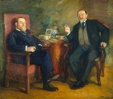 На картине изображена сцена из бытовой жизни: за столом, на котором разложены книги и расставлены две чашки на блюдцах, сидят друг напротив друга двое пожилых мужчин. Оба персонажа расположились в креслах с высокими спинками и держат в руках сигары, что подчёркивает атмосферу неспешной беседы. Композиция построена так, чтобы подчеркнуть интимность и камерность обстановки.