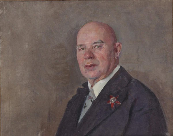 Полотно представляет собой погрудный портрет пожилого мужчины с выраженными чертами возраста и лысиной. На тёмном пиджаке изображён Орден Красной Звезды, из-под которого виден ворот белой рубашки. Лицо и фигура персонажа обращены вправо относительно зрителя. Фон выполнен в желтовато-серых тонах, подчёркивая сдержанную цветовую среду композиции.