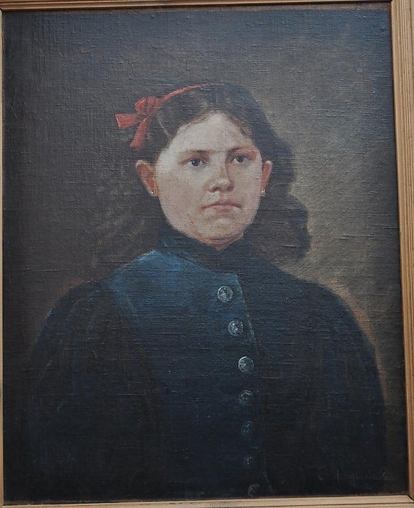 На полотне представлен погрудный портрет молодой девушки с круглолицым лицом, изображённой в небольшом повороте вправо. Во вьющихся волосах заметен красный бантик, в ушах — маленькие серьги. Девушка одета в тёмно-синее платье с воротником-стойкой, пышными рукавами и рядом пуговиц. Фон выполнен в тёмных, нейтральных тонах, что подчёркивает фигуру на переднем плане.