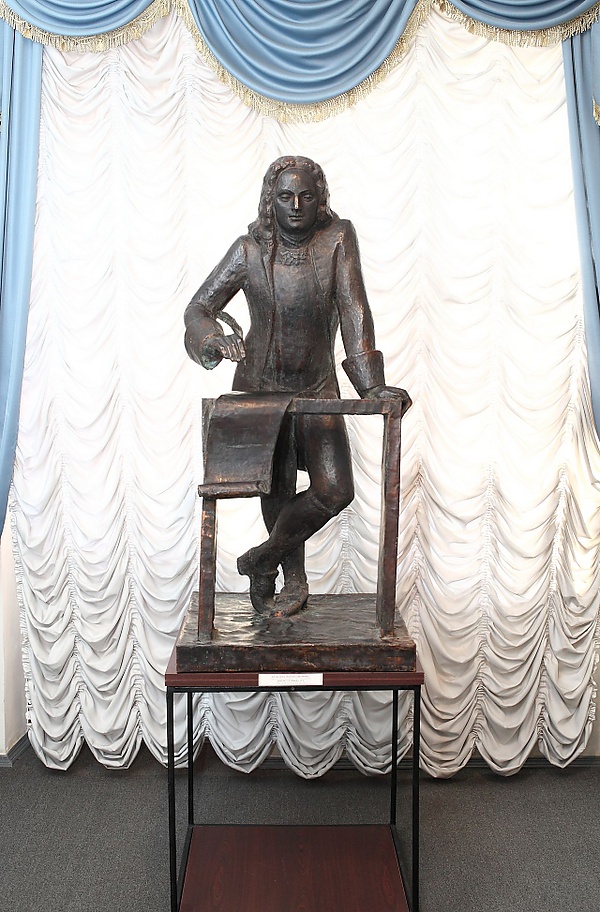 Экспонат представляет собой мужской портрет в полный рост. Фигура изображена на постаменте. На нём мужчина в кудрявом парике, камзоле и туфлях на каблуке. Образ расположен перед столом, на котором слева лежит свиток бумаги. В правой согнутой и приподнятой руке скульптор изобразил перо. Левой рукой объект опирается на стол. Левая нога, согнутая перед правой, опирается на носок. Размеры произведения составляют 115,0 х 50,0 х 50,0 см.