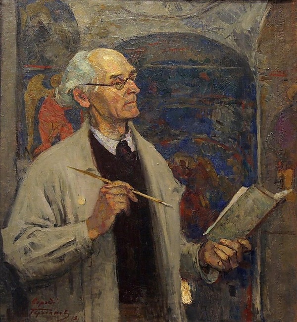 Поясной портрет изображает художника в профиль на фоне древнерусских росписей, которые он реставрировал. Черты лица выделяются высоким лбом, длинными седыми волосами и очками. Художник одет в белый халат, под которым видны белый воротничок рубашки, галстук и густо вишнёвый джемпер, подчёркивающий лицо. В правой руке он держит кисть, что указывает на его профессиональную деятельность в области реставрации. Композиция объединяет фигуру портретируемого с характерным фоном.
