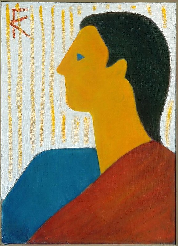 На полотне представлен погрудный портрет женщины с профильным поворотом головы влево. Лицо и шея написаны жёлтым цветом, один глаз выделен насыщенным синим оттенком. Волосы гладко зачёсаны и имеют чёрный цвет. На плечах изображена одежда, напоминающая шаль: правая часть выполнена в синем, левая — в охристом цвете. Фон картины белый с жёлтыми вертикальными полосами. Необычная цветовая гамма подчёркивает выразительность образа и акцентирует внимание на деталях композиции.